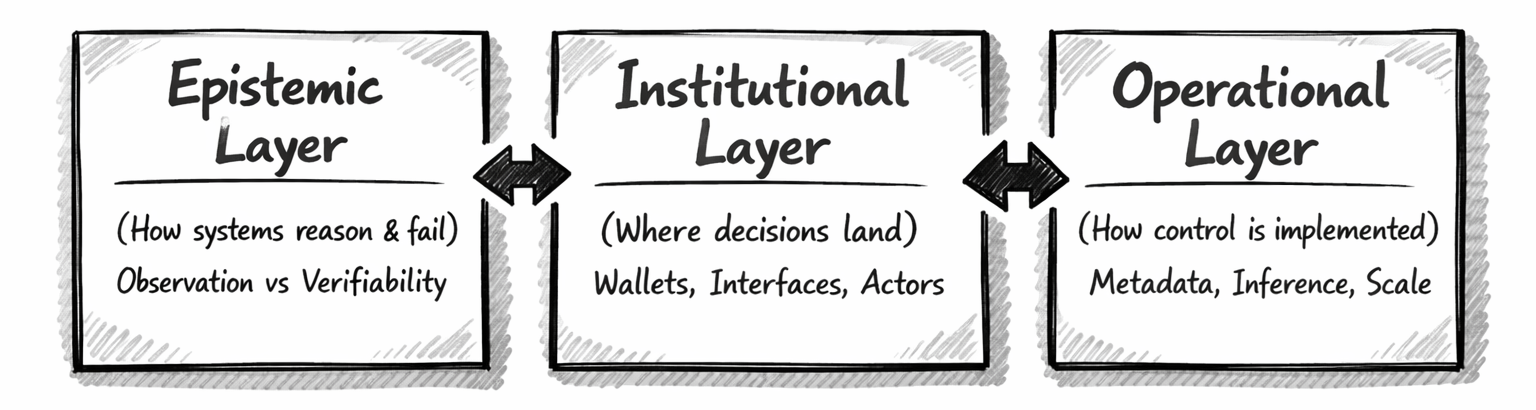 It focuses on how systems replace proof with observation, and why unverifiable systems drift toward surveillance as a technical fallback. Concepts in this layer explain why systems become legible in ways their designers did not intend.